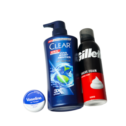 Clear Men Cool Short Mennthol Anti Dandruff Shampoo 450ml & Vaseline Lip Therapy – Original 20g & Gillette Original Scent Shave Foam Scented 200ml combo