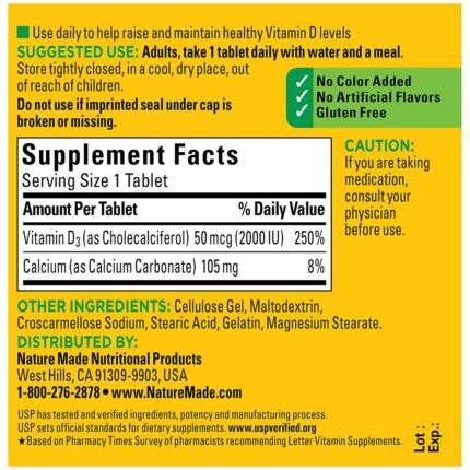 Nature Made Vitamin D3 Vitamin D 2000 IU 50 mcg 100 Tablets