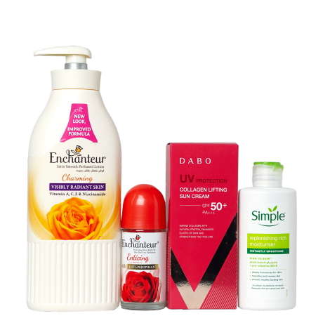 Enchanteur Charming Perfumed Lotion 400ml & Simple Kind To Skin Replenishing Rich Moisturiser 125 ml & Enchanteur Enticing Perfumed Deo Roll-on 50ml & Dabo UV Protection Collagen Lifting Sun Cream SPF 50+ PA 70ml combo