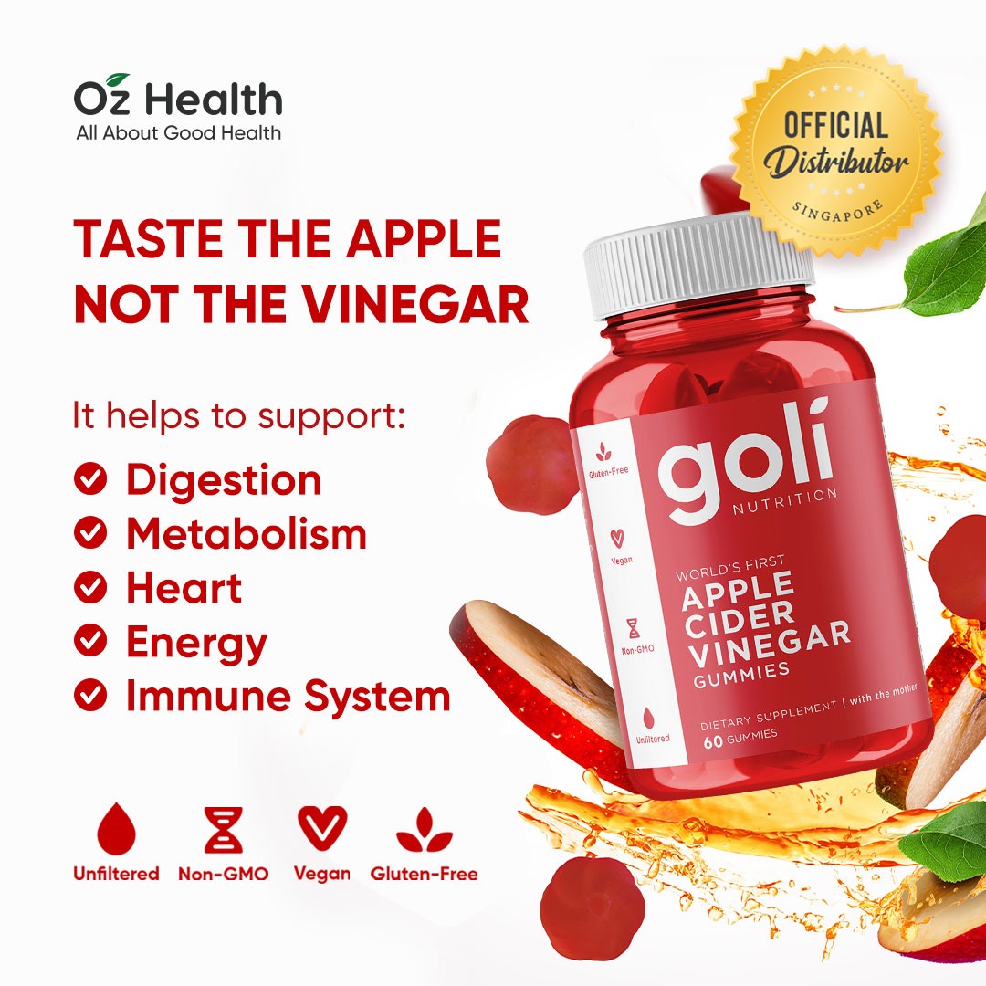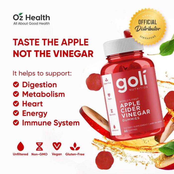 Each bottle of Goli Apple Cider Vinegar Gummies contains 60 delicious Vegan, Non-GMO, Gluten & Gelatine-free Gummies.