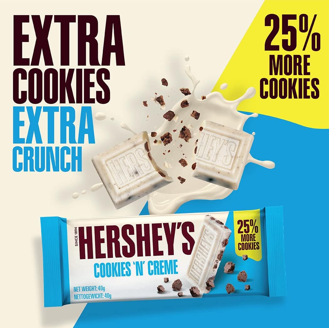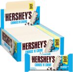 Hershey’s Cookies ‘n’ Crème Bar – Enjoy crunchy chocolate cookie bits in smooth white chocolate flavour candy! Discover the delicious taste of Hershey’s and you’ll understand why it’s so hard to resist. This Cookies ‘n’ Crème bar is a unique combination of classic, white chocolate flavour with pieces of crunchy cookie. A delicious cookie crunch in every mouthful! Hershey’s bars make a great gift for loved ones and those wanting to make an American chocolate hamper. Eat by itself or add to baking or topping cupcake creations. Suitable for vegetarians and available as a 24 Pack of 40 g bars.