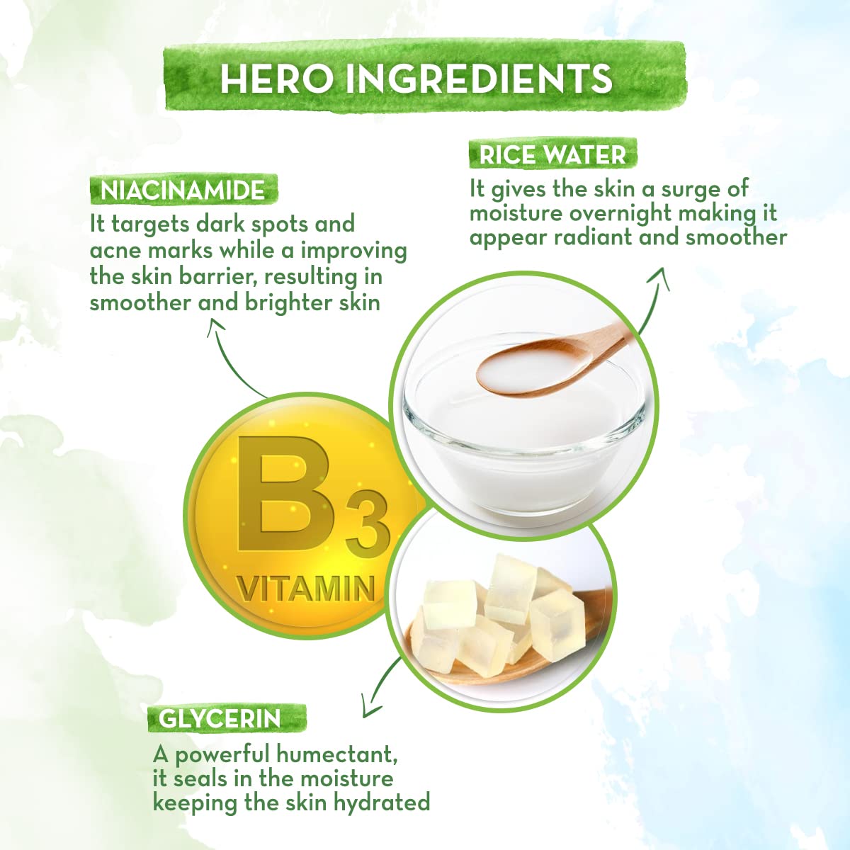 Wake up to luminous glass skin with Mamaearth Rice Night Cream. Crafted with the goodness of Rice Water, the night cream nourishes your skin overnight & gives it a boost of hydration, leaving your skin dewy & radiant. The goodness of Niacinamide in the night cream strengthens your skin’s barrier & boosts ceramide production. Niacinamide is also proven to reduce acne marks & blemishes making your skin appear even-toned & visibly brighter. Enriched with moisturizing ingredients like Shea Butter & Glycerin, Rice Night Cream revives your skin’s glow overnight, giving you that enviable glass-like skin in the morning. And, it’s Made Safe Certified which means it contains no toxins or harmful chemicals, just the goodness of nature.