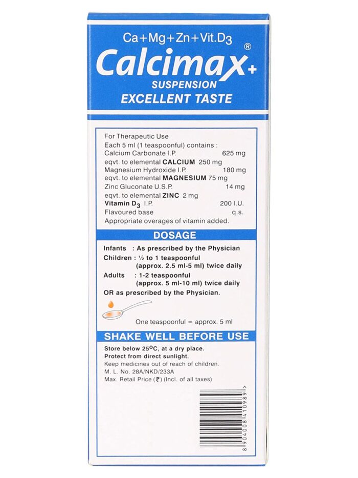 • Calcimax+ Suspension provides Calcium, Magnesium, Zinc, Vitamin D3 and essential micronutrients to help growing children to maintain strong bones.in D3