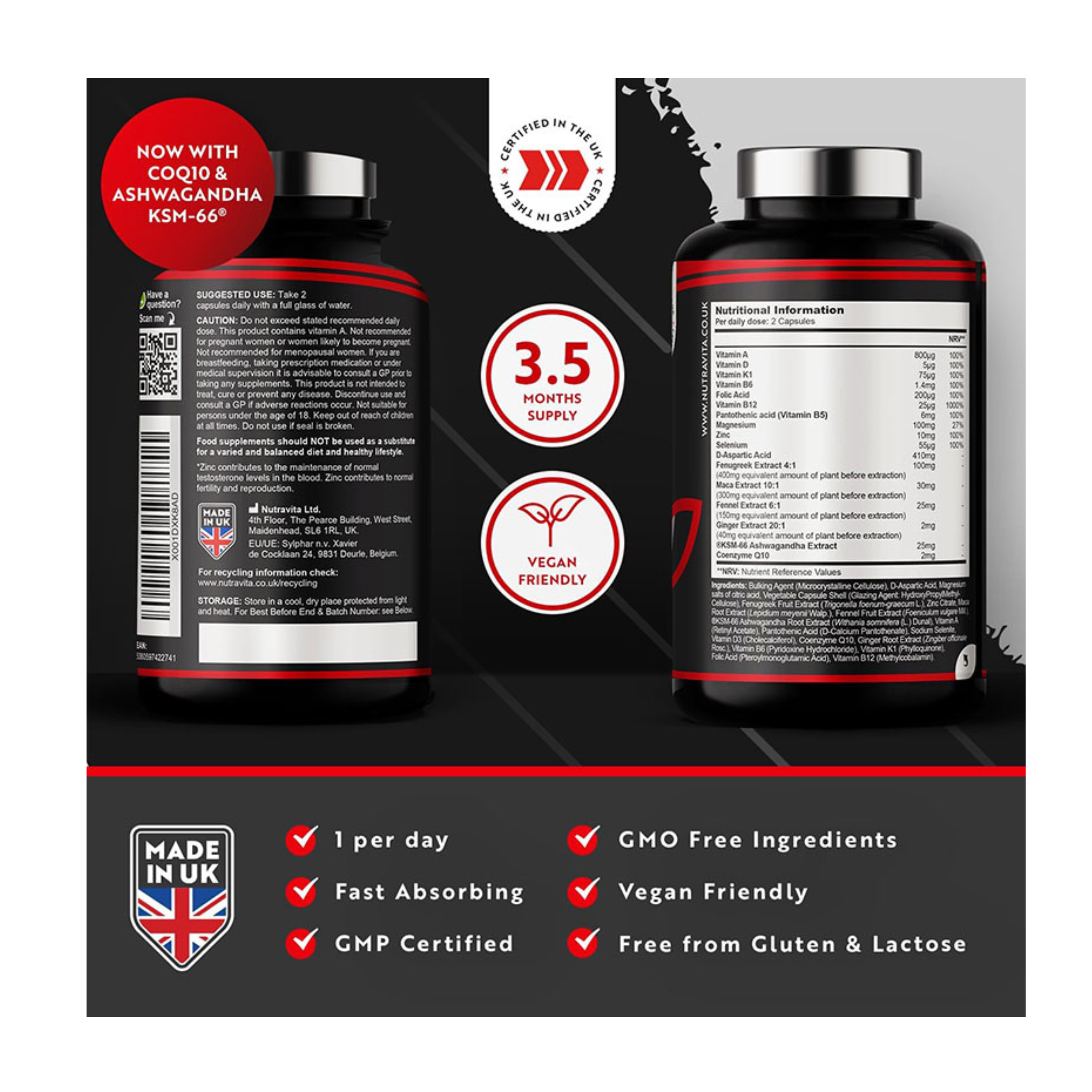 TestoMax 2.0 è stato formulato utilizzando ingredienti potenti di alta qualità. Ciò include una miscela essenziale di vitamine e minerali contenente magnesio e vitamina B5 che contribuiscono entrambi al normale metabolismo energetico insieme ad acido D-aspartico, fieno greco, maca, ashwagandha KSM-66 clinicamente testato, CoQ10 e zinco che possono aiutare ad aumentare naturalmente il testosterone livelli.