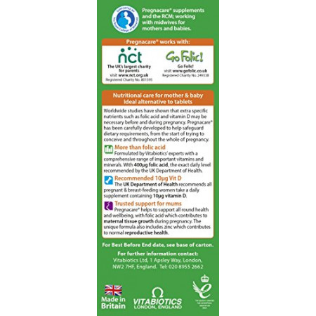 Pregnacare Liquid is a scientifically developed formulation of 18 important vitamins and minerals, including 400mcg folic acid and 10mcg vitamin D, the exact levels as recommended by the UK Department of Health. The supplemental folic acid intake increases maternal folate status. Folic Acid is also beneficial beyond 12 weeks as it contributes to maternal tissue growth during pregnancy. Vitamins B2, B6 and B12 which contribute to normal red blood cell formation; while Zinc contributes to normal reproductive health. The formula does not contain Vitamin A as high levels are not advised in pregnancy.