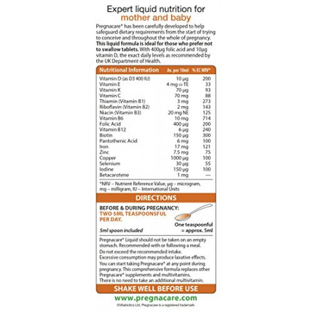 Before and during pregnancy: Two 5ml teaspoonfuls per day. (One teaspoonful = approx.5ml. 5ml spoon included) Shake well before use. Pregnacare Liquid should not be taken on an empty stomach. Recommended with or following a meal. Do not exceed the recommended intake. Excessive consumption may produce laxative effects. You can start taking Pregnacare at any point during pregnancy. This comprehensive formula replaces other Pregnacare supplements and multivitamins. There is no need to take an additional multivitamin.