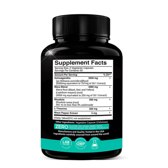 Unleash your body’s limitless potential with our 4-in-1 herbal supplement packed full of 5000mg ashwagandha, 4000mg maca root extract, 500mg Rhodiola and 200mg L-theanine, along with 5mg black pepper extract per serving. Containing 30:1 extract of ashwagandha and 20:1 extract of maca blend and Rhodiola Rosea root with no less than 5% salidroside, this complex has been meticulously formulated to unlock your vitality.